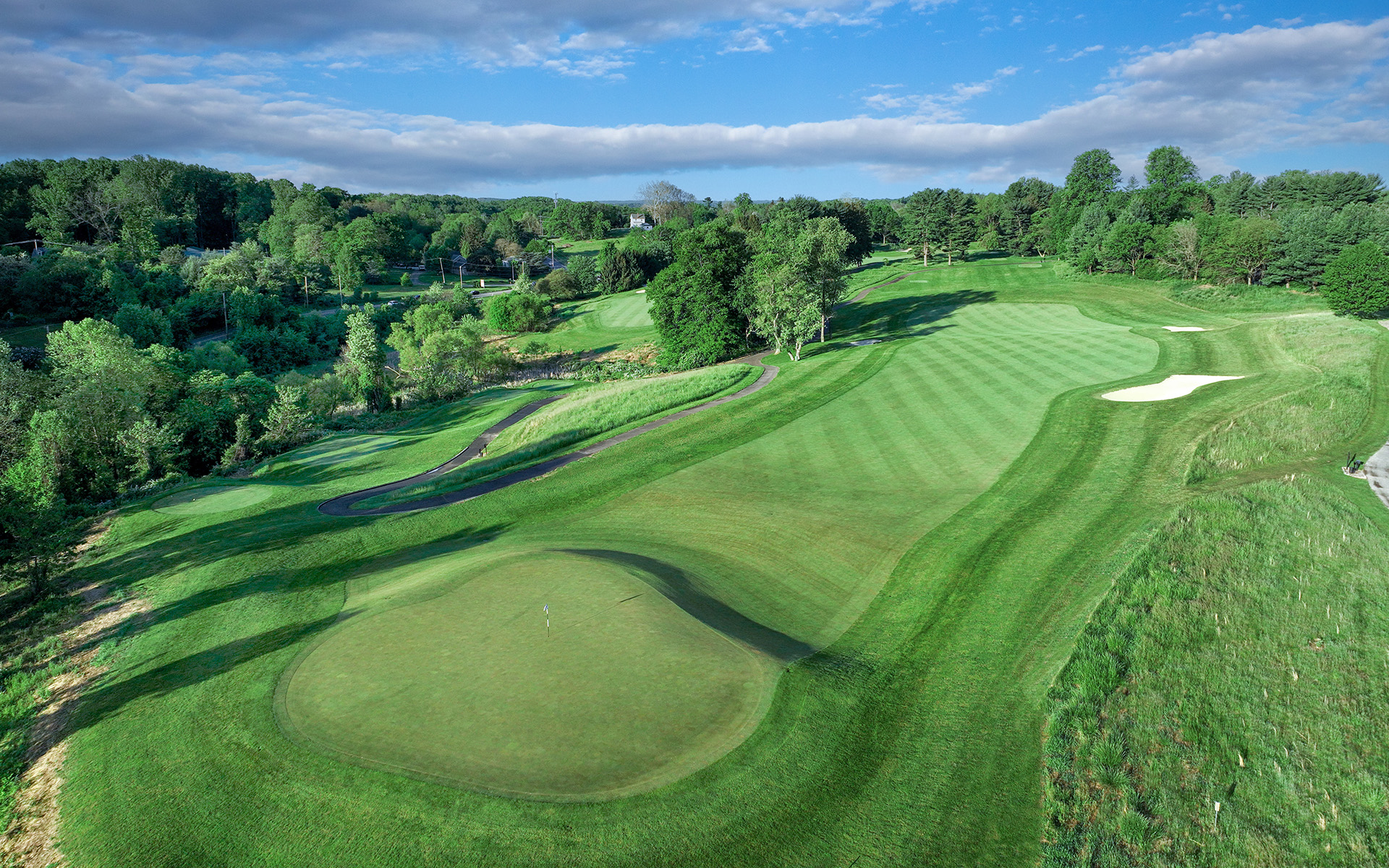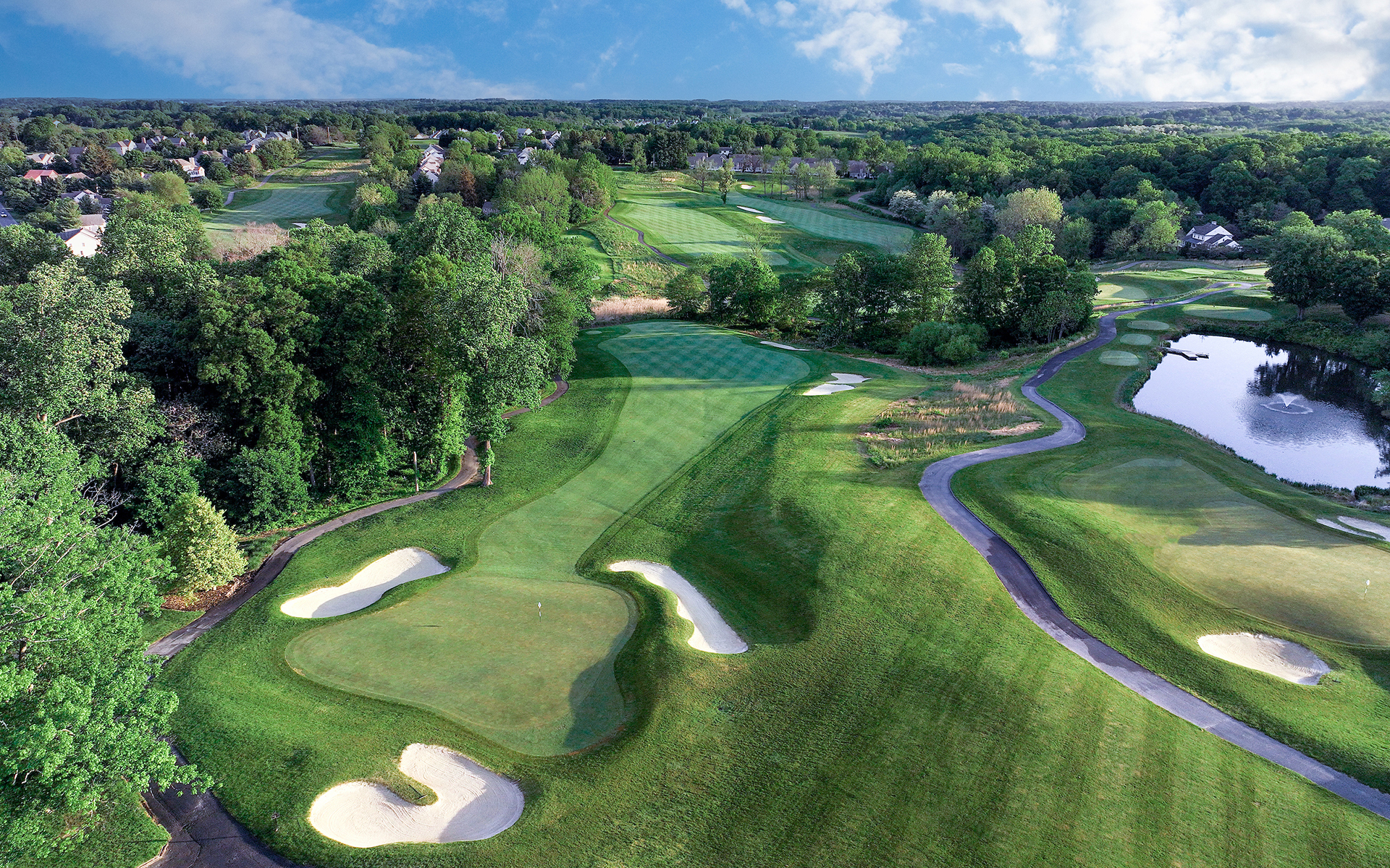 The golf course layout showcases Fazio's artistry, its captivating elevation changes weaving through old-growth oak, beech, holly, and pine trees, all framing stunning vistas. Sunlight glints off meticulously sculpted greens, while terraced tee boxes tempt golfers of all levels with their strategic challenges. Hartefeld National is the quintessential destination for those seeking the pinnacle of Pennsylvania golf - a symphony of natural beauty, expert design, and exhilarating competition.